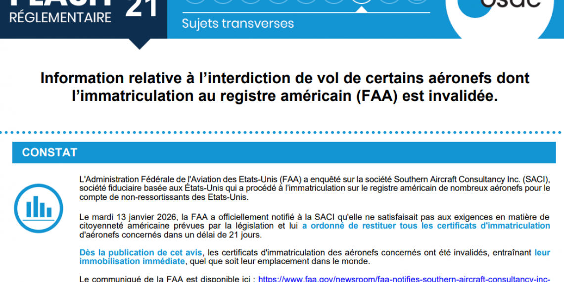 Le mardi 13 janvier 2026, la FAA a officiellement notifié à la SACI qu'elle ne satisfaisait pas aux exigences en matière de citoyenneté américaine prévues par la législation et lui a ordonné de restituer tous les certificats d'immatriculation d'aéronefs concernés dans un délai de 21 jours.